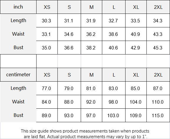 This size guide shows product measurements taken when products are laid flat. Actual product measurements may vary by up to 1".
